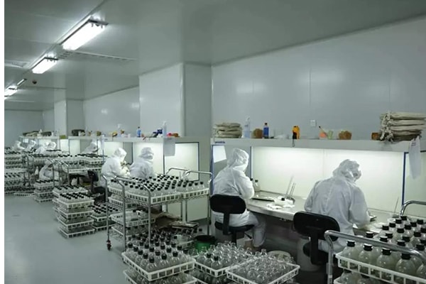 5、通过漏斗或下口杯将培养基注入组组织培养容器内,注入量为瓶容积的十分之一左右。灌装要迅速,尽可能避免培养基粘在瓶壁上,且应在培养基未冷却之前灌装完毕。